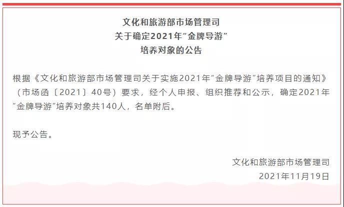 “金牌導游”培養(yǎng)項目是文化和旅游部加強導游隊伍建設的重要舉措,旨在通過加大對一線優(yōu)秀導游的培養(yǎng)與支持,鼓勵入選對象開展業(yè)務研究和實踐,以點帶面、示范引領提高導游隊伍專業(yè)素養(yǎng),提升旅游服務質量發(fā)揮積極作用。